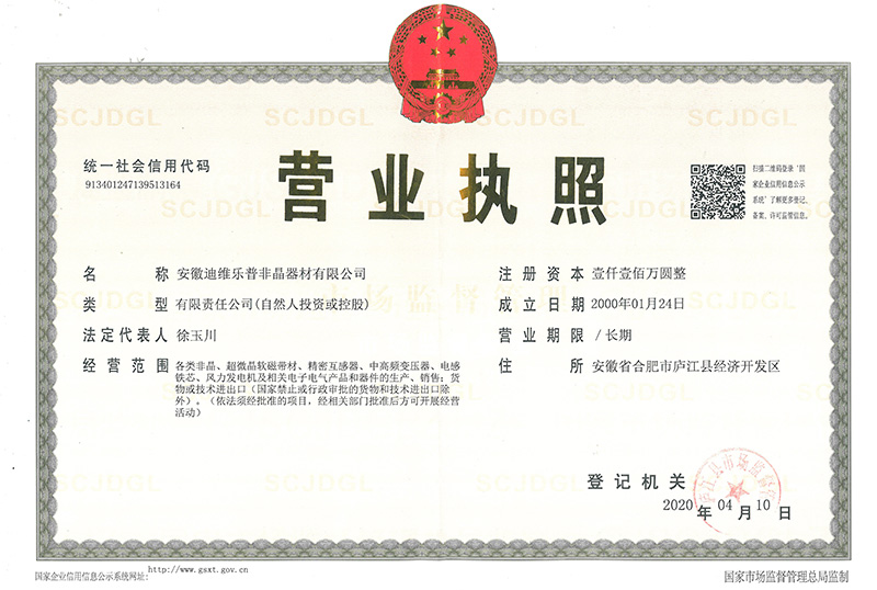 • 安徽迪維樂(lè)普非晶器材有限公司2019年安徽省“專精特新”中小企業(yè)名單的公示